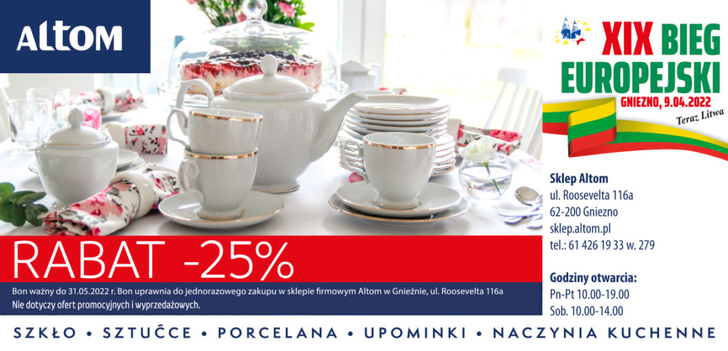 Już po raz kolejny możemy liczyć na naszego partnera i sponsora: firmę Altom. Gnieźnieńska firma dla wszystkich biegaczy przekaże plastikowy bidon z wyciskaczem do cytrusów, voucher upominkowy oraz bawełnianą torbę, w którą będzie można spakować cały pakiet.