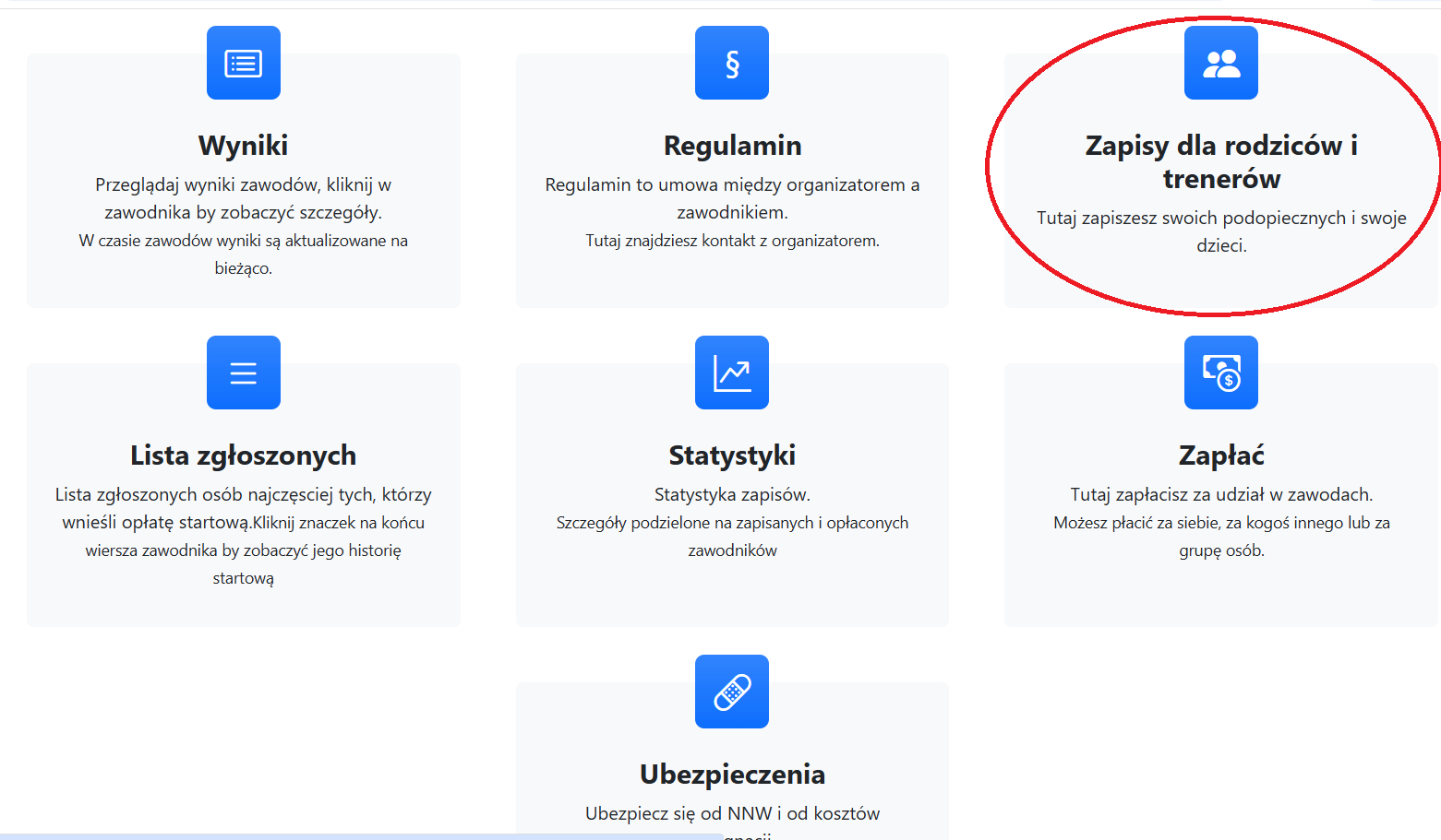 - Wybieramy zakładkę „Zapisy dla rodziców i trenerów”.
