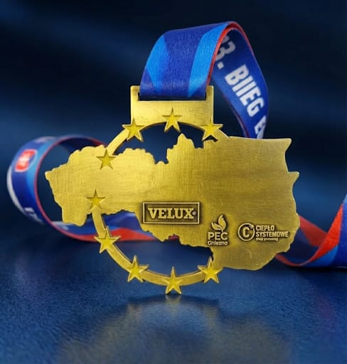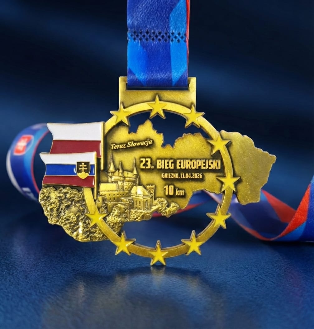 Wyjątkowe miejsce w tegorocznej edycji zajmuje medal 23. Biegu Europejskiego. To właśnie na nim najmocniej wybrzmiewa słowacki akcent. Medal swoim kształtem nawiązuje do konturu Słowacji, a jego centralnym elementem jest Zamek w Bojnicach – jeden z najbardziej rozpoznawalnych i malowniczych zabytków tego kraju. Całość dopełniają europejskie gwiazdy, które podkreślają ideę Biegu Europejskiego